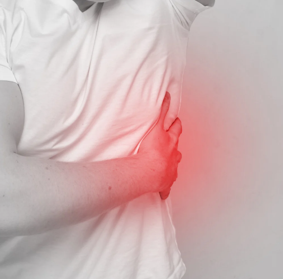 오른쪽 갈비뼈 아래에 위치한 간이 부어오르거나 염증이 생길 경우, 오른쪽 흉곽과 겨드랑이 부위에 압박감이나 통증이 전이될 수 있습니다. 오른쪽 어깨나 등으로 통증이 퍼지는 특징도 함께 나타납니다.